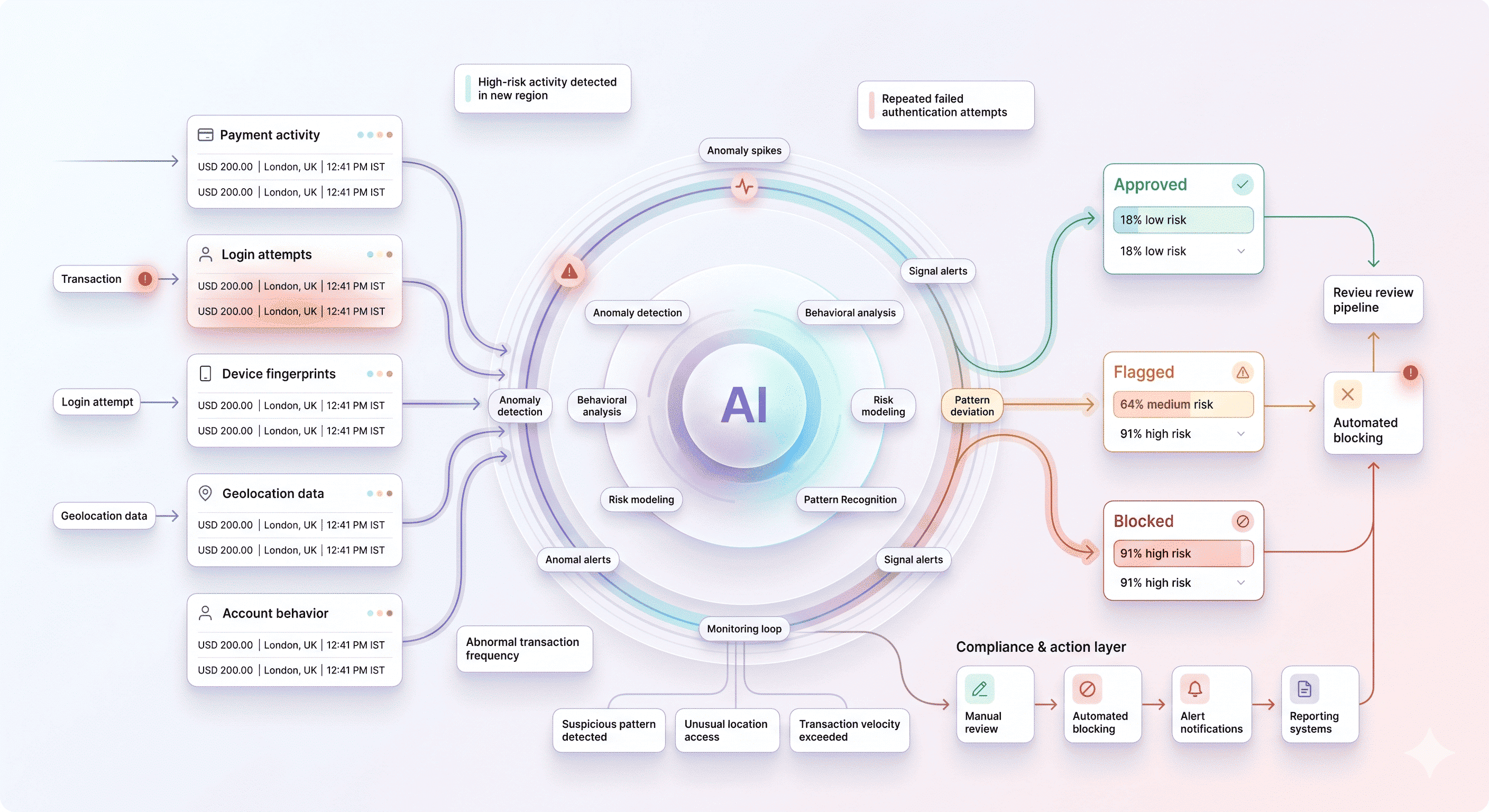 AI models process hundreds of variables (location, velocity, device ID) in milliseconds. By scoring these against known patterns, the system approves or blocks transactions before payment authorization completes.