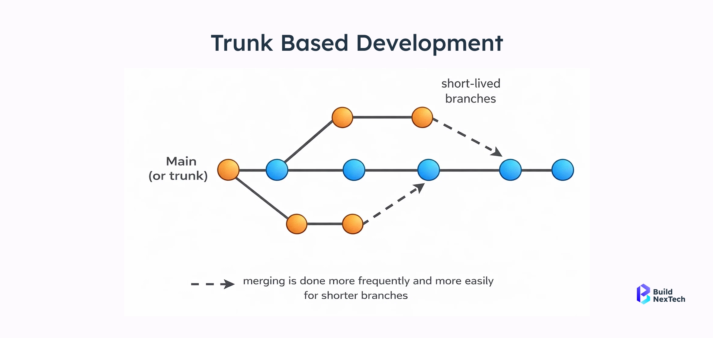 Modern CI/CD pipelines are built around one assumption: code is integrated continuously. Trunk-Based Development directly supports this by encouraging small, frequent merges into a shared main branch. Without frequent integration, CI pipelines lose their effectiveness and become delayed feedback systems instead of real-time quality gates.