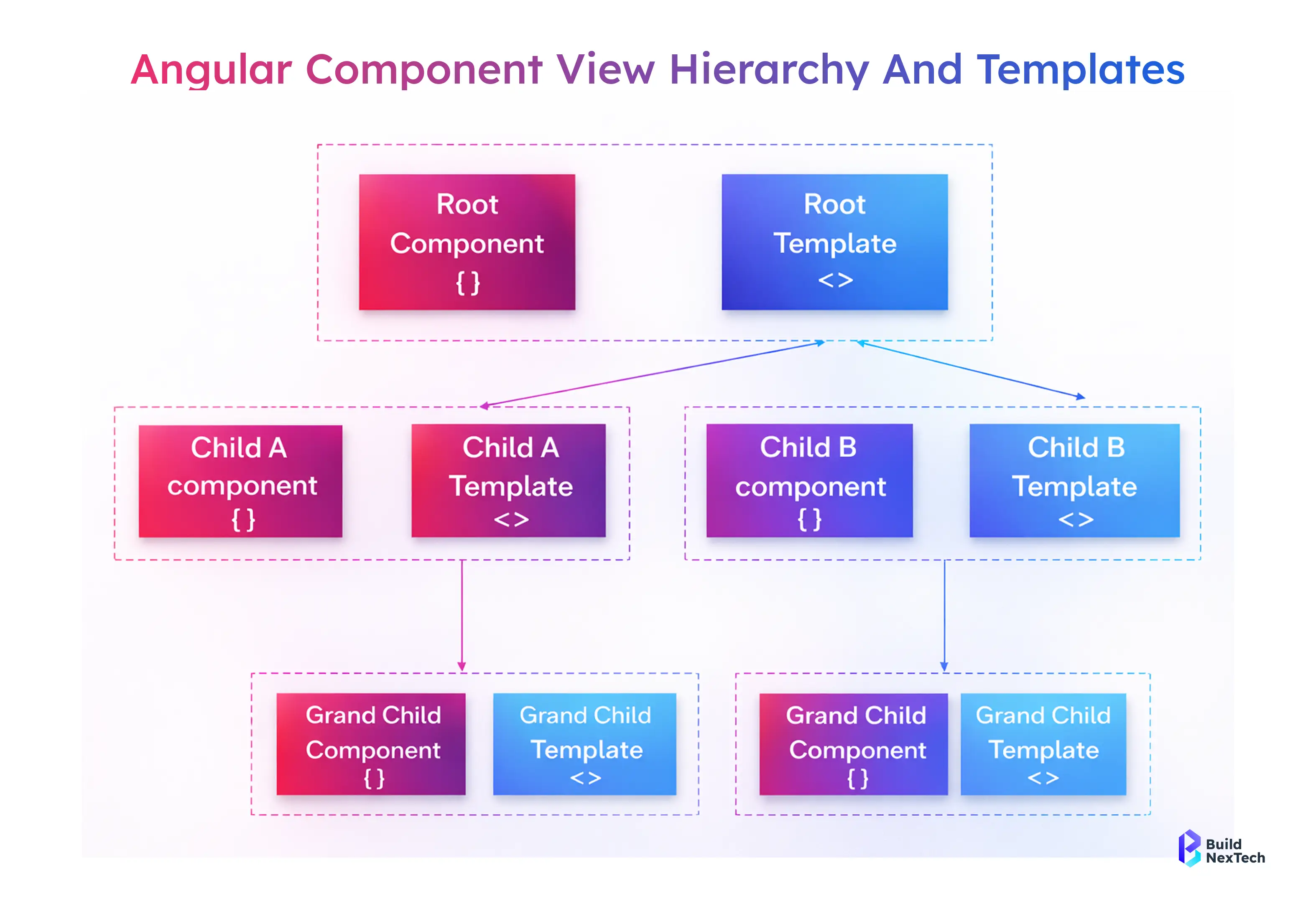 The image illustrates Angular’s component view hierarchy, showing how a root component uses its template to host child components, which can further contain their own templates and nested (grandchild) components. It demonstrates how Angular organizes the UI in a hierarchical structure using components and templates.