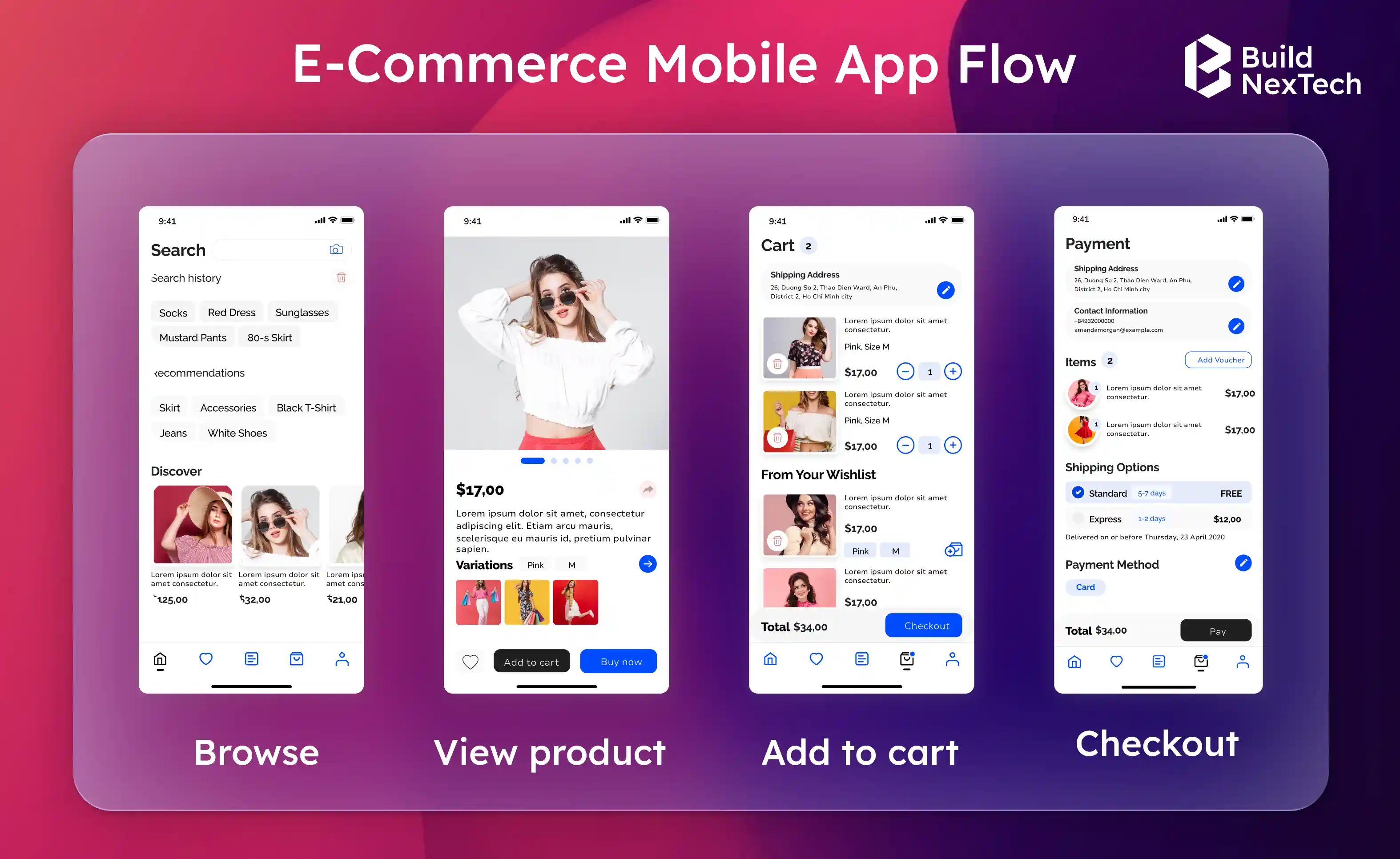 Modern e-commerce mobile apps are built around a simple and predictable buying flow—browse → view product → add to cart → checkout exactly like the interface shown in the image below. A clear product listing screen, quick access to product details, and a streamlined checkout view help users complete their purchase without confusion or delay.